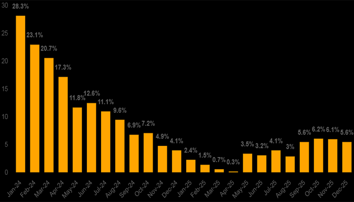 The latest figure marks a decline from November 2025, when consumer price index (CPI) inflation stood at 6.1 percent. It also shows a notable increase compared to December 2024, when inflation was recorded at 4.1 percent, reflecting changes in base effects and price trends over the past year.